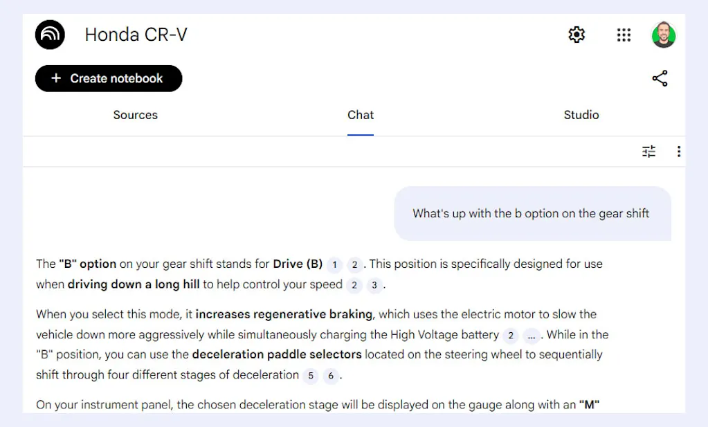 Later, after downloading a PDF of the manual from Honda’s website and then uploading it into NotebookLM, it took me all of 10 seconds to reach the same answer—simply by asking.