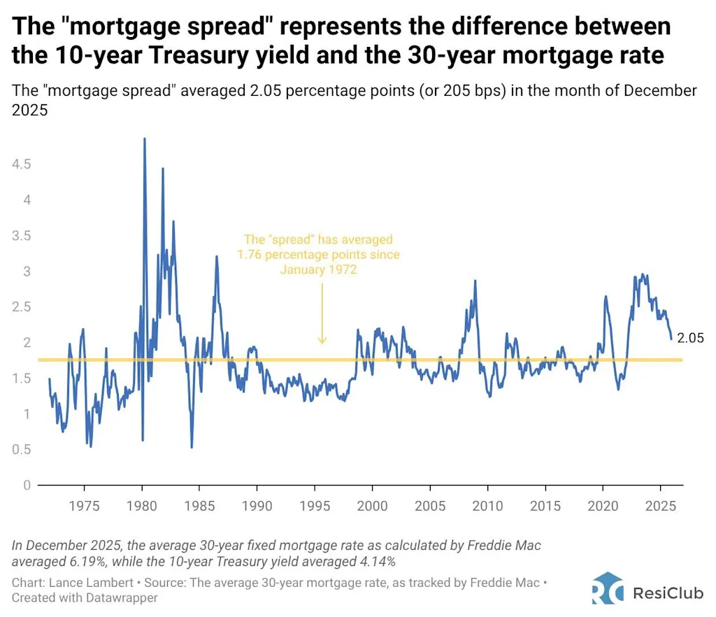 Over the past 2 years, the “mortgage spread” has slowly compressed—hitting 2.05 percentage points (205 bps) in December 2025.