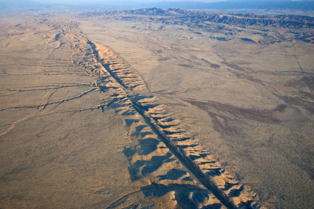 An aerial view of the San Andreas Fault crossing the Carrizo Plain in California.