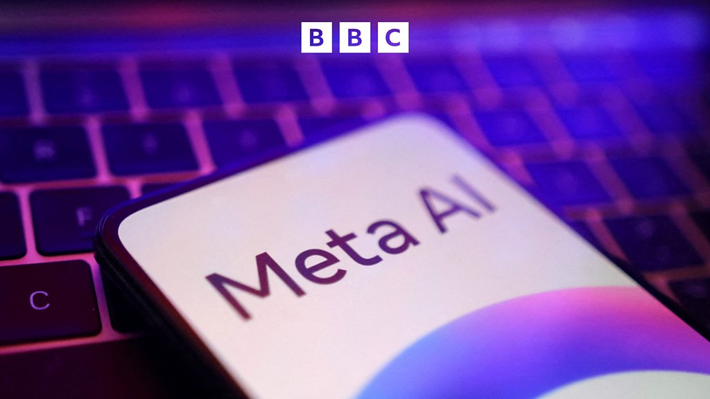 (Image: The words “Meta AI” are displayed on a smartphone screen. The phone is resting on a laptop keyboard. Credit: Reuters)